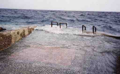 Schnorcheln: Kleineres Hausriff über eine Leiter sehr gut erreichbar aber leider schon stark geschädigt, trotzdem dank intensiver Fütterung großer artenreicher Fischbestand. Achtung, Steinfische am Fuß der Leiter gesichtet! Direkt links und rechts dieser abgebildeten Leitern (hier bei ungewöhnlich rauer See) beginnt das Hausriff.