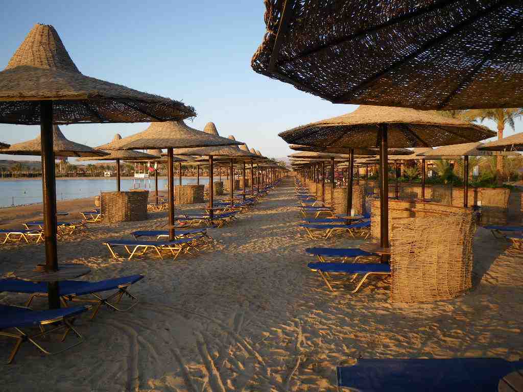 Bei unserem Kurzbesuch im letzten Herbst waren wir von der engen Bebauung es Strandbereichs mit Sonnenhüten doch etwas schockiert. Während unseres Aufenthalts hat sich dies aber nicht als Nachteil herausgestellt. Es könnte aber auch daran liegen, dass ein Trakt gerade renoviert wird und nicht belegt war. Es gab noch zu jeder Zeit freie Liegen. Die Liegen sind allerdings sehr niedrig was knielahmen Leuten Probleme beim Aufstehen macht. Der Windschutz kann je nach Wind verstellt werden. Er war uns aber nur manchmal im Weg für den Schattenplatz. Windschutz war nicht erforderlich. Alles wird abends wieder wie mit dem Lineal ausgerichtet.