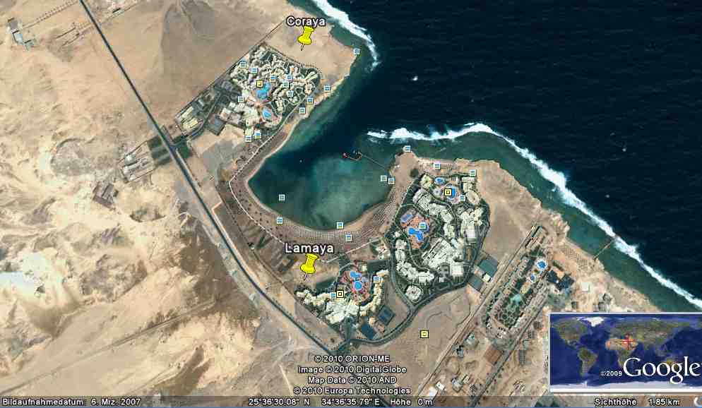 Da wir im letzten November im Mangrove doch nicht so sehr zufrieden waren weil der Zugang zum Wasser dort recht schwierig ist haben wir uns das Coraya vorsorglich noch angeschaut. Auf Google Earth sieht man eben leider nicht die Wassertiefe!
