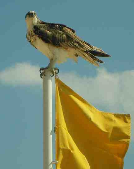 Dann war ab und zu der Hausadler auf der Fahnenstange vor dem Strand zu Besuch, Fahnen stören ihn nicht:
