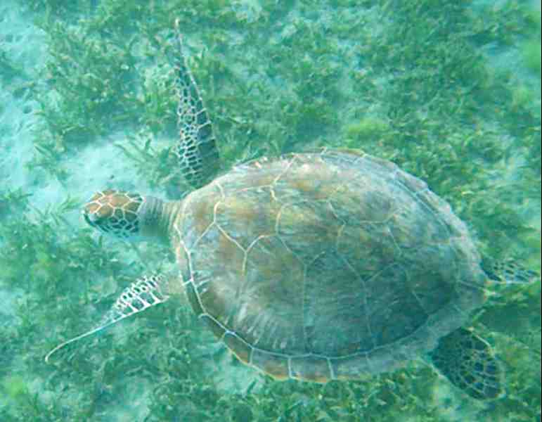 In der Coraya Bucht sind jetzt auch Schildkröten zu Hause und weiden die Seegrasstummeln in der Bucht ab. Sie sind schon recht zutraulich und lassen sich nicht stören, wenn man nur etwa einen Meter über ihnen schwimmt.