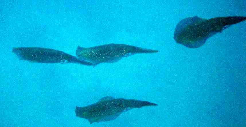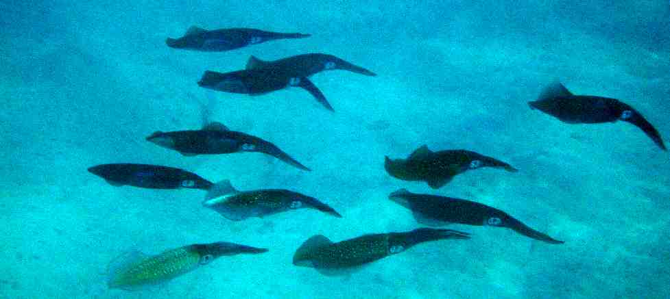 Im 2010 Urlaub hatte es meist einen kleinen Schwarm Sepien in der Bucht. Sie sind sehr scheu, hielten sich aber meist im nur 2 Meter tiefen Wasser auf. Nach einem erfolgreichen Kampf mit der Kamera (sie wollte wegen der vielen Reflexionen nicht fokussieren) hat es doch ein paar Bilder und ein Video gegeben. In welche Richtung schwimmen sie nun?