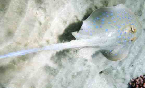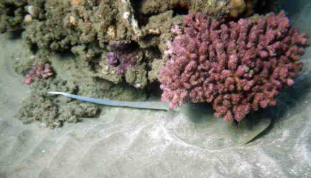 Blaupunktrochen gab es wieder jede Menge zu sehen, meist unter überhängenden Korallen. Schon an dem kleinen Riff rechts nicht weit vom Strand.