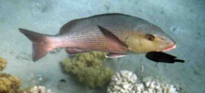 Könnte das wohl ein kleiner Napoleon mit Putzerfisch sein?