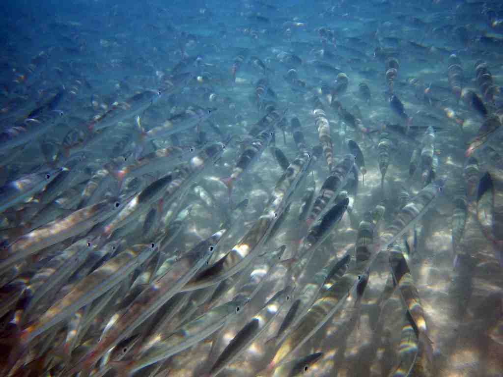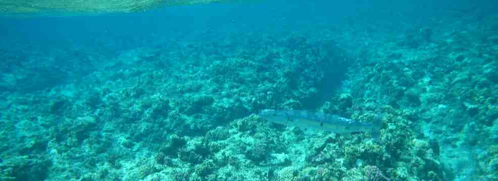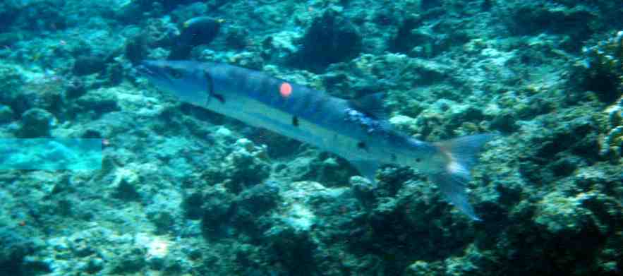 Ein Blick entlang der Oberfläche lohnt sich auch immer mal: Hier ein leicht angeschlagener Barrakuda mit viel Angst.
