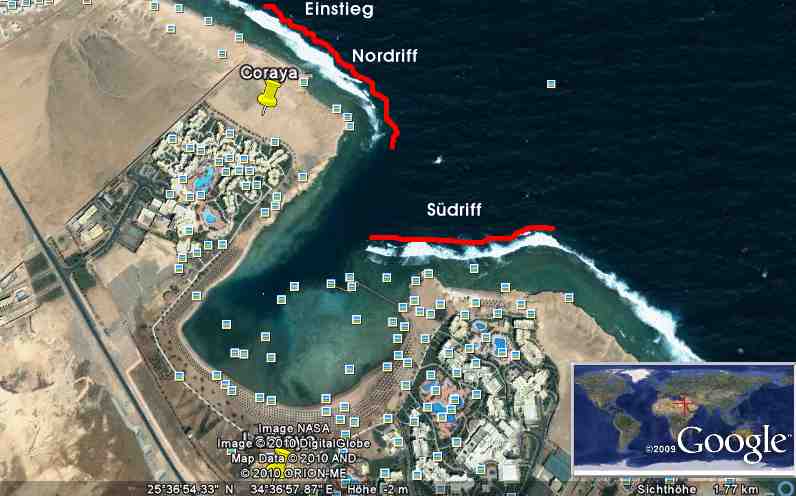 In der Bucht gibt es auch schöne Riffe aber noch schöner sind natürlich die Außenriffe. Man sollte dafür aber doch einigermaßen windstille Tage abwarten da der Einstieg am Nachbarhotel doch recht problematisch ist. Auch sollte man die Strömung am Südriff nicht vergessen - der Rückweg dauert meist doppelt so lange als der Weg in Richtung Süden. Das Südriff erreicht man vom normalen Strandeinstieg, dann das Hausriff entlang und nach dem Steg die Bucht queren - Achtung vor dem Standbootfahrer!!! Hier die Karte zur Orientierung: