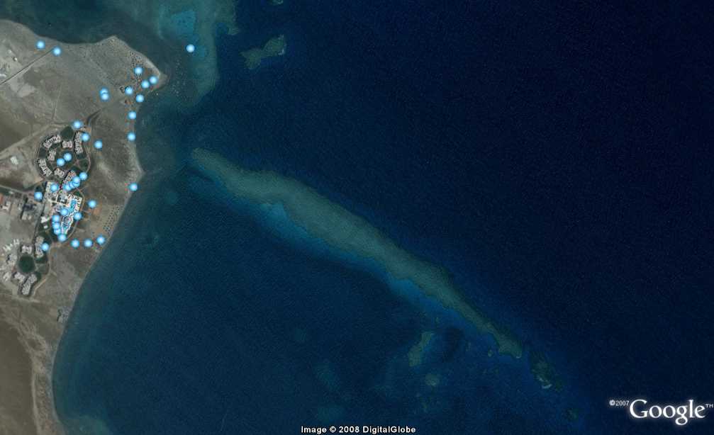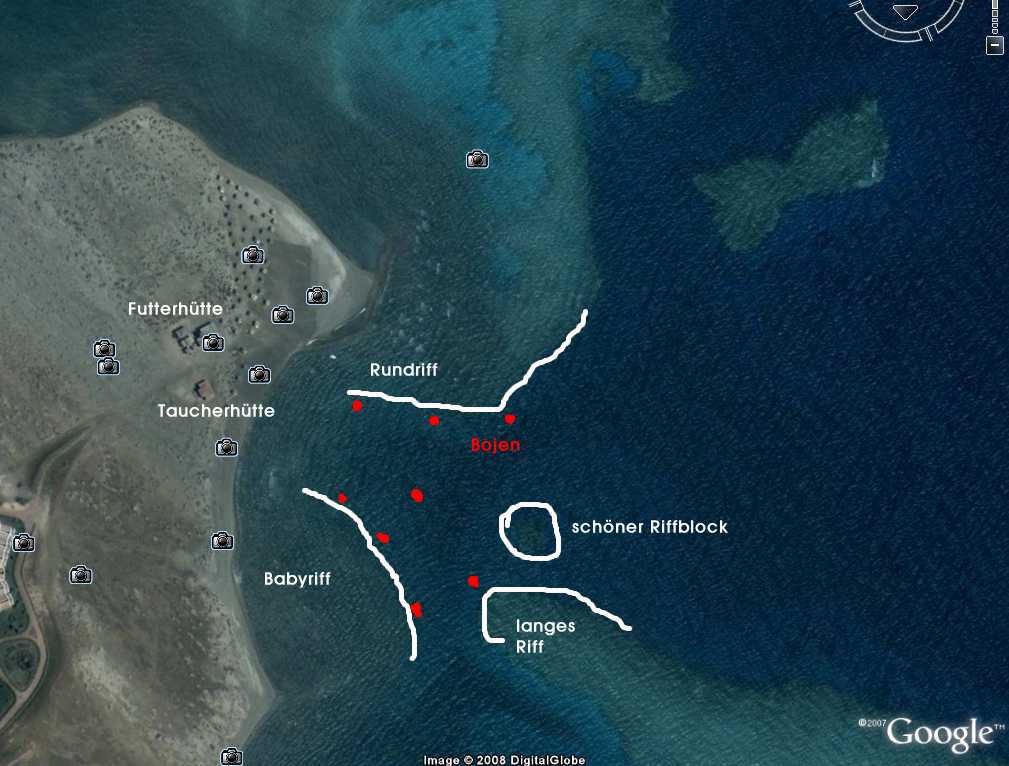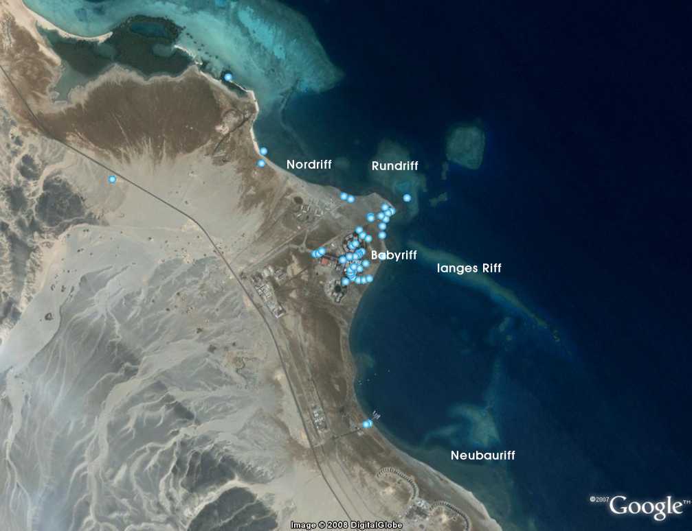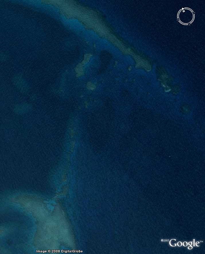 Da ich mir Weihnachen 2007 die Umstellung auf einen neuen PC, ISDN und DSL angetan habe (es ist inzwischen Juli und es funktioniert immer noch nicht alles so wie ich es gerne hätte) kann ich jetzt au selbst in GOOGLE EARTH nach Riffbildern suchen. Bekannte haben zwar behauptet, dass man dort nichts finden würde weil es militärisches Sperrgebiet ist, das trifft aber nicht zu. Es gibt doch immer noch eine Menge Leute, die ihr Wissen nicht mit anderen teilen wollen.