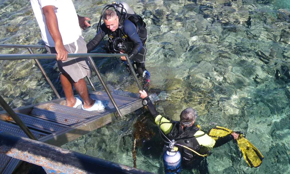 Am Steg ins Wasser gehen ist auch keine echte Freude. Ein Teil des Stegs ist vollgeräumt mit den Tauchutensilien und auf dem Rest muss man sich dann zwischen sich umziehenden Tauchern durchzwängen. Die Leiter ist fast unterbrechungsfrei voll mit Tauchern die ihre Flossen noch im Wasser direkt an der Treppe ausziehen weil die Treppe nicht mit Flossen begangen werden kann. Es ist wirklich so, dass man kaum ins Wasser kommt. Dann endet die Treppe in ca. 1,5 Meter tiefem Wasser. Man sollte besser nirgends neben den 2 flachen Steinen mit den Beinen auf Grund kommen! Dann folgt in kurzem Abstand die Seilarie: Hier legt eine größere Zahl von Seilen an der Wasseroberflächen was zwar den Tauchern nichts ausmacht als Schnorchler hat man aber nach jedem Seil das Rohr voll.
