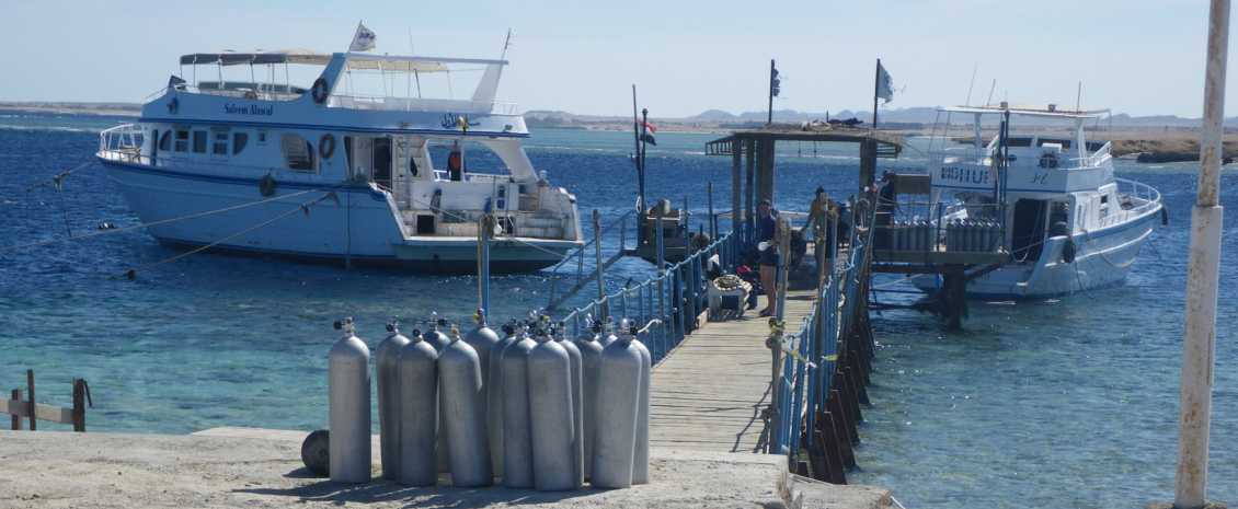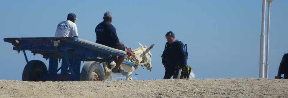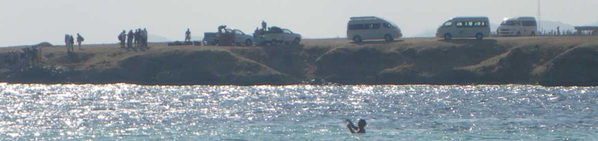 Auf der anderen Seite der Bucht werden täglich ganze Herden von Tauchern angekarrt die dann über das Riffdach ins Wasser gehen. Es sind oft mehrere Busse mit den zugehörigen Versorgungsfahrzeugen. Das ist allerdings auch kein Wunder da man in anderen Hotels oft überhaupt nicht ins Wasser kommt. Im benachbarten "Dreams Beach" (sollte besser Horrorbeach heißen) waren an den meisten Tagen gleich 3 rote Fahnen aufgezogen. Der Steg endet dort am Saumriff und der Wellengang ist bei Wind gewaltig.