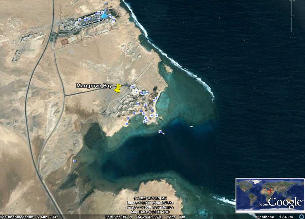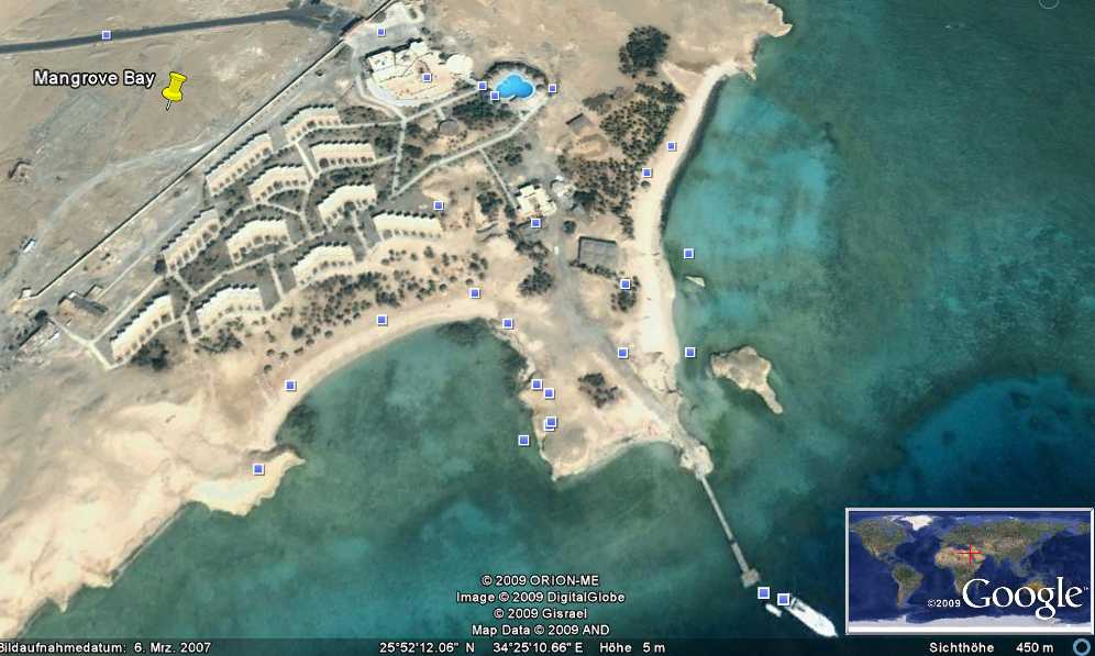 Nachdem wir letztes Jahr vom Lahami Bay nach 8 Jahren Abschied genommen haben sind wir auf der Suche nach einem neuen Hotel auf das Mangrove Bay gestoßen und haben unseren Novemberurlaub 2009 dort verbracht. Auswahlkriterien waren neben der Beurteilungen in holidaycheck.de auch unsere Suche in Google Earth nach einer schönen Sandbucht. Hier 2 Aufnahmen von oben: