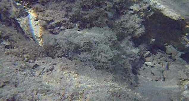 Aber eigentlich sind wir ja nicht wegen des Essens nach Ägypten gefahren sondern um zu schwimmen und schnorcheln. Leider wurden wir da gleich am ersten Tag auf den Boden der Tatsachen zurückgeholt: Geht nicht oder nur eingeschränkt! Man hat zwar vor den Liegen eine schöne Bucht nur leider mit einer Wassertiefe von 10 bis 50 cm je nach Ebbe und Flut und einem Untergrund den man nach 10 Metern besser nicht mehr betritt. So wie eben ein abgestorbenes Korallendach aussieht. An Schwimmen ist nicht zu denken! So mal schnell zur Abkühlung ins Wasser rennen - geht nicht! Das war die größte Enttäuschung des Urlaubs und wohl auch der Grund warum wir nicht wieder kommen. Gut, bei Flut können erfahrene Schnorchler vom Strand aus über das Riffdach kommen aber in 30 cm Tiefe lauert zwischen den Steinen nicht nur ein Steinfisch (nur für Kenner auszumachen, zur Orientierung: Der schwarze Punkt genau in der Bildmitte ist das Auge):